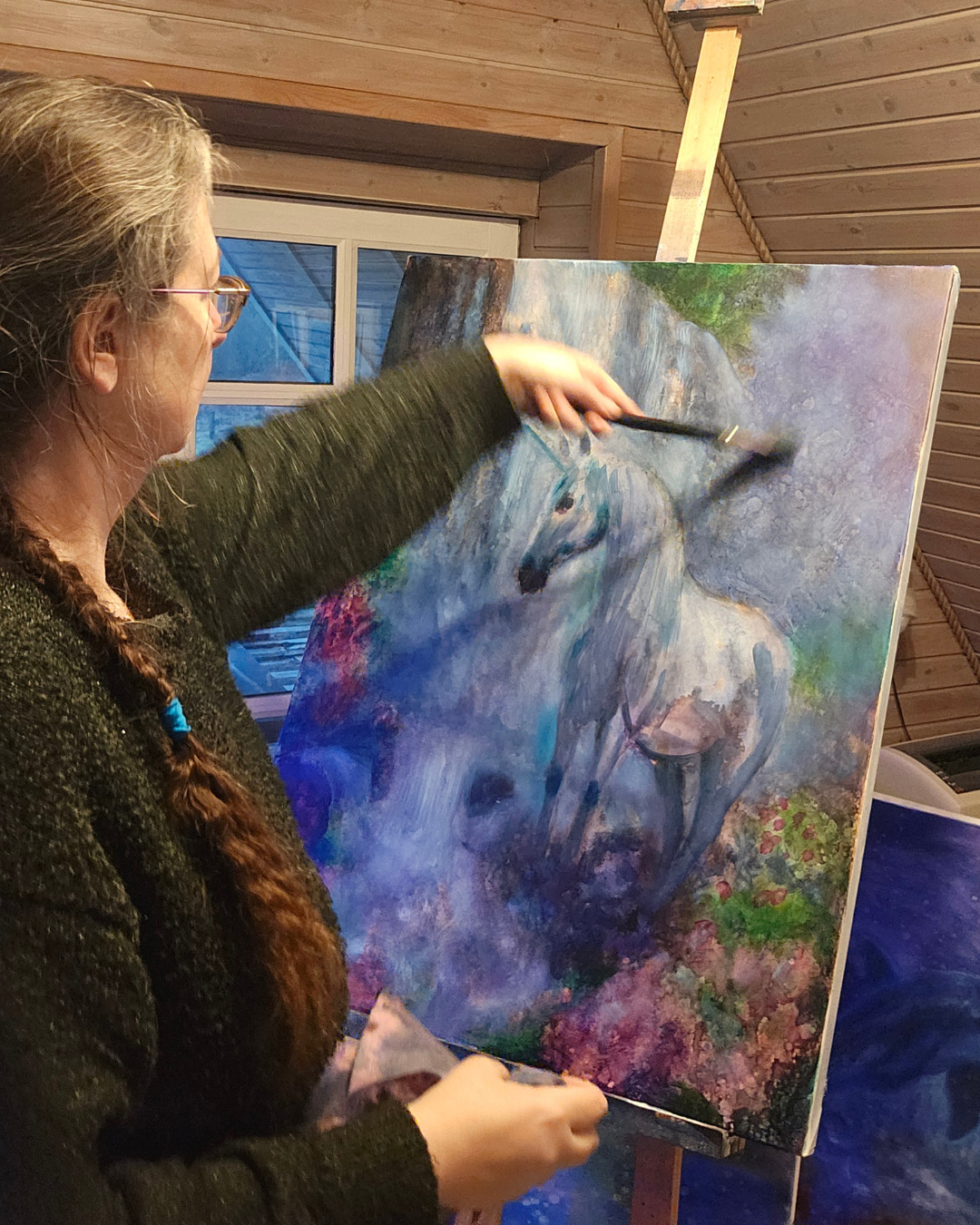 Kunsten blev et sted at samle det hele. Erfaringerne fra et liv med ansvar, brud og genopbygning fandt form i farver, symbolik og bevægelse. Ikke som fortællinger, der skal forstås, men som stemninger, der kan mærkes.