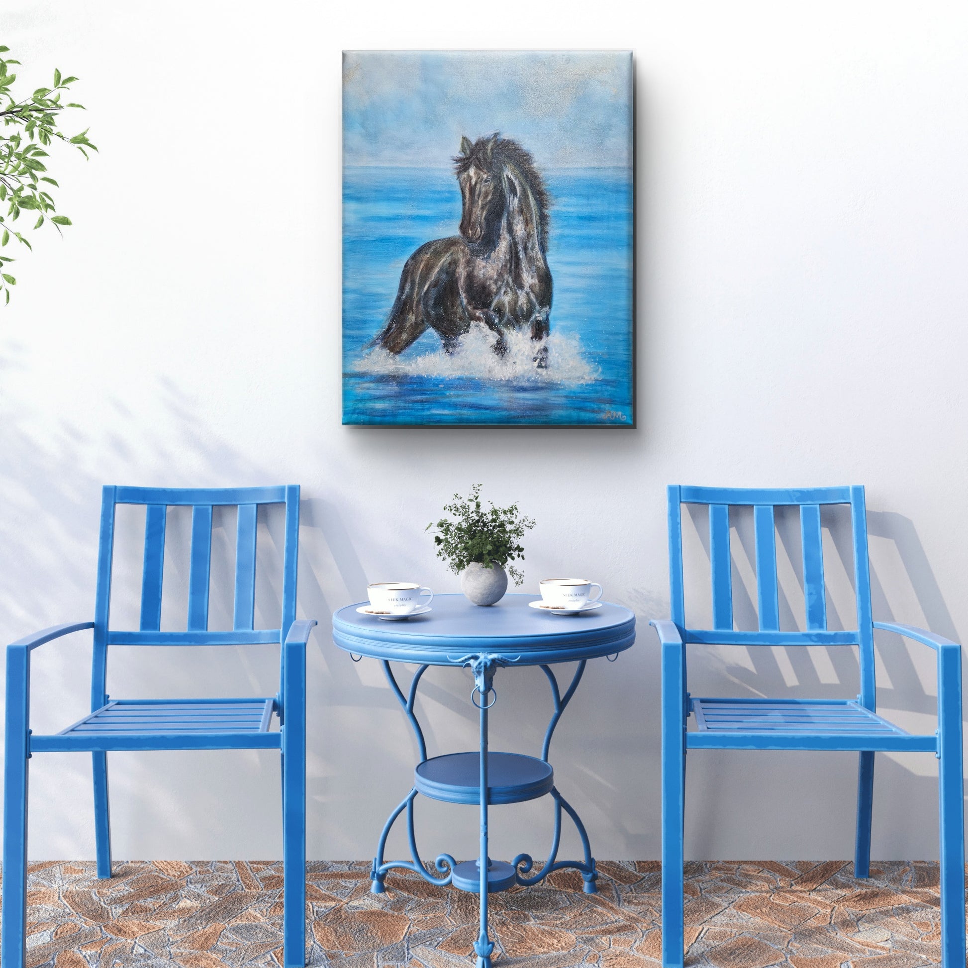 En sort hest rejser sig fra havets blå dybder, omgivet af glimt af lys og bevægelse. Vandet sprøjter omkring den som symbol på fornyelse og livskraft. Dens blik er roligt, men beslutsomt – en påmindelse om, at sand styrke ikke handler om kontrol, men om tillid til den kraft, der bor i os.