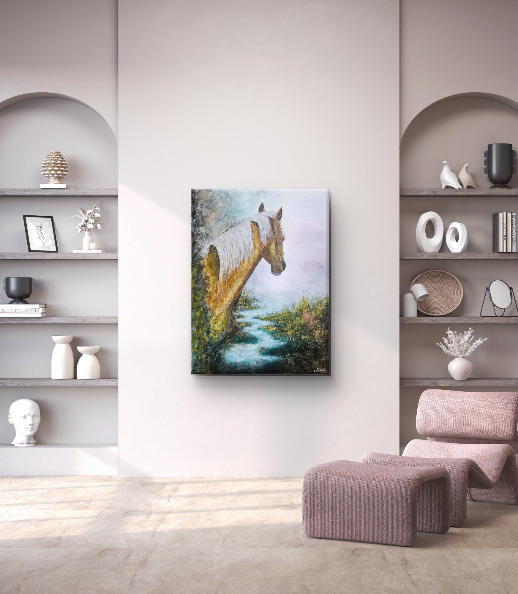 En hest står på kanten af et foranderligt landskab, omgivet af blide nuancer af blå, grøn og rosa. Lyset breder sig som et løfte om håb, mens vandets overflade spejler både dybde og klarhed. Hesten kigger fremad, som om den sanser vejen før den viser sig, og minder os om, at forvandling ikke kræver hast, men nærvær.