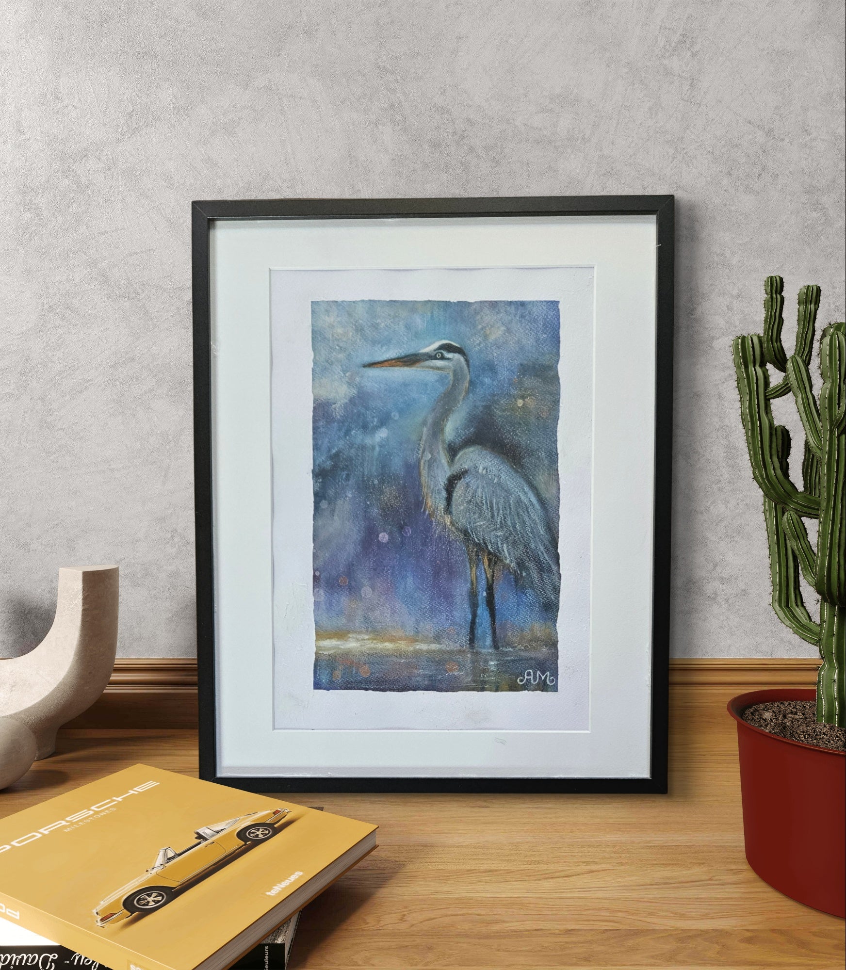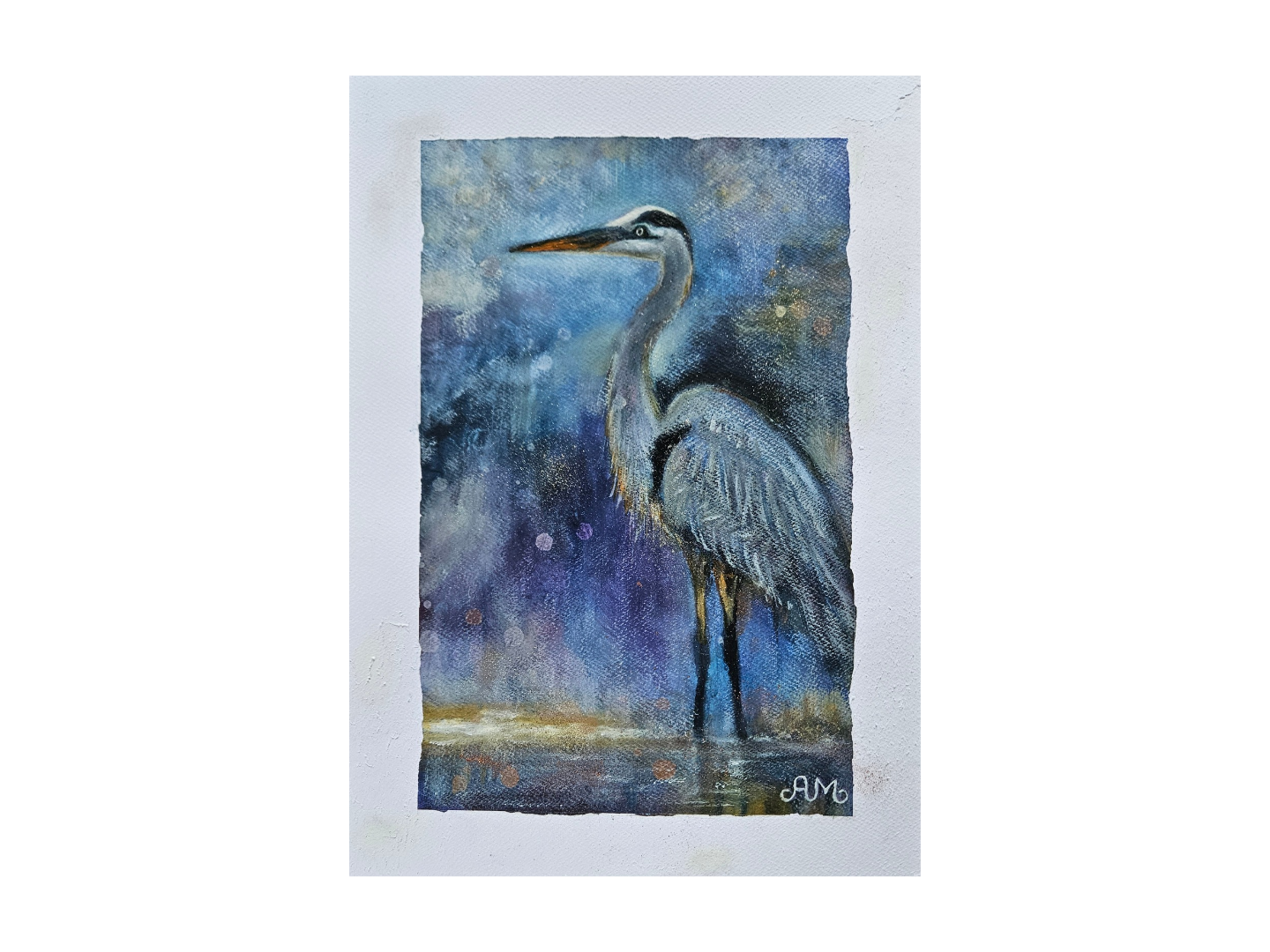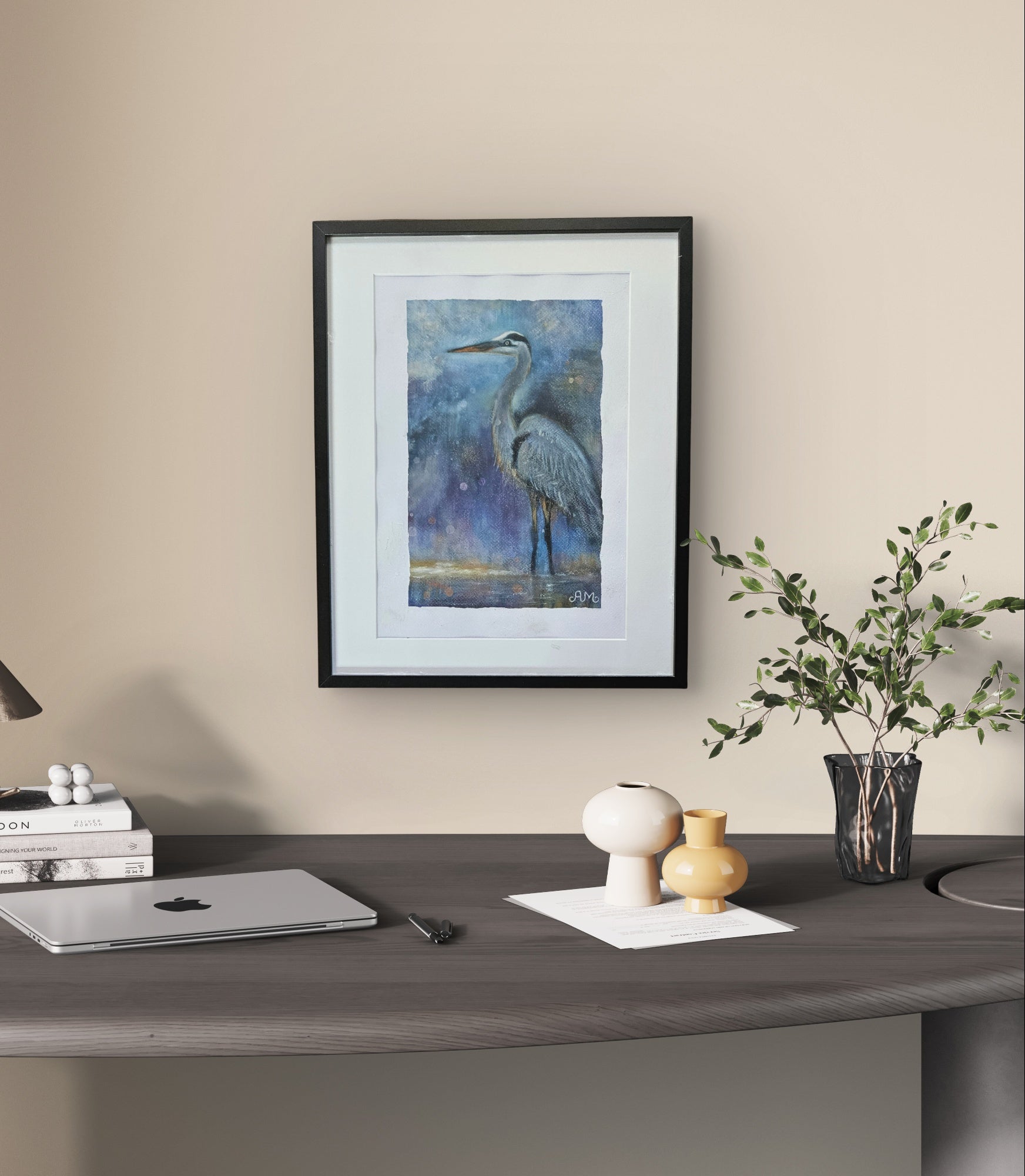 Fiskehejren står roligt og vågent i et landskab, der balancerer mellem drøm og virkelighed – som et symbol på tålmodighed, vedholdenhed og indre retning.
