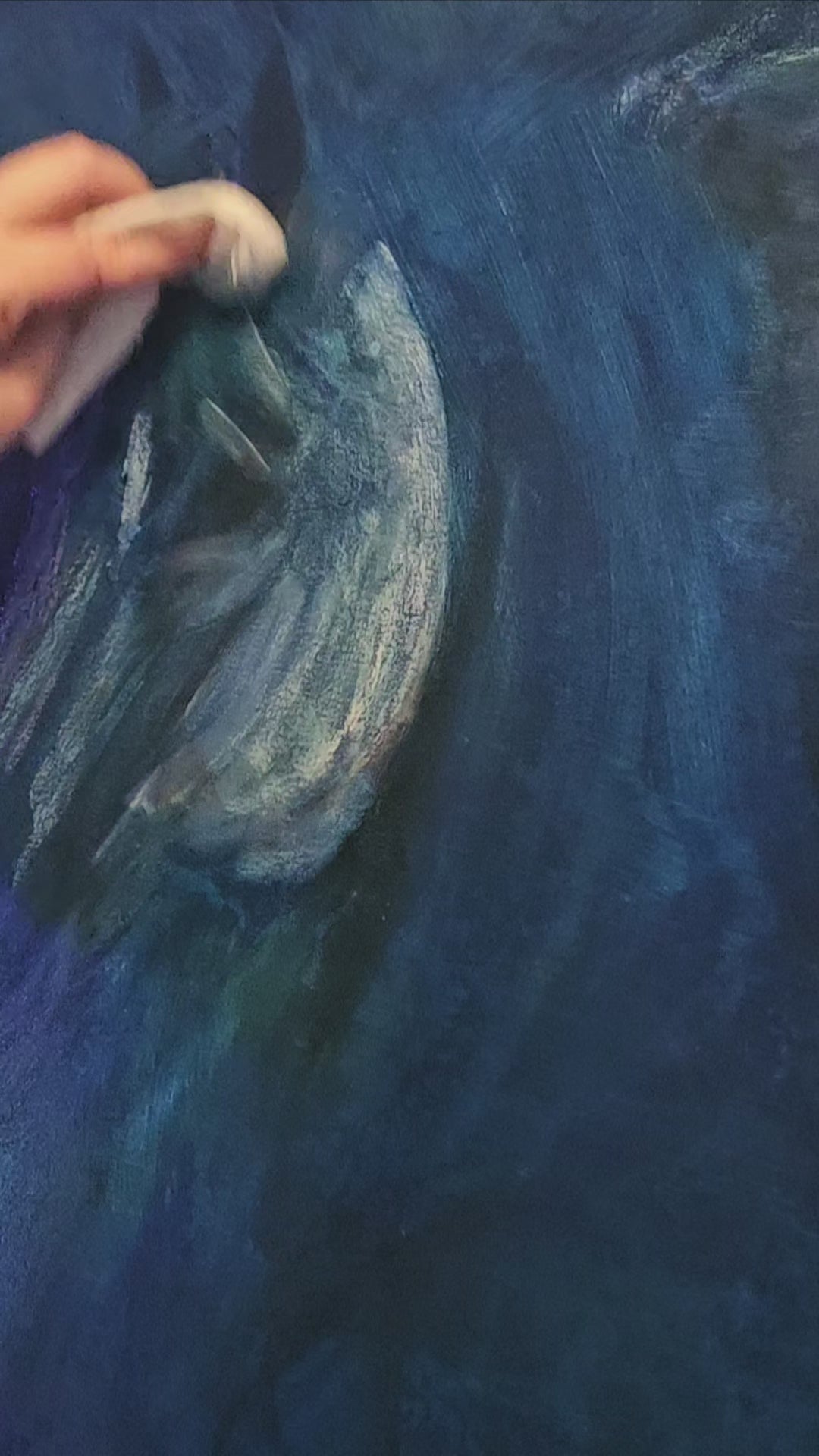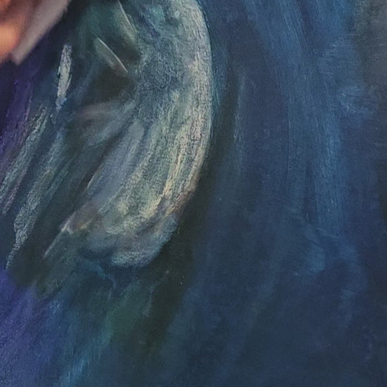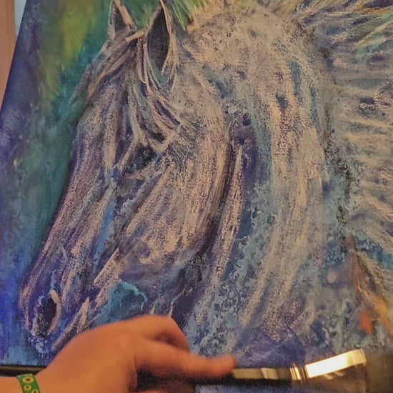 Med olie på lærred skaber lag af blå, violette og sølvskinnende nuancer en dybde, der trækker beskueren ind i maleriets hypnotiske energi. Den hvide hest, symbolet på renhed og sjælens frihed, fremstår næsten lysende mod den kosmiske baggrund – en skabning af både vand og stjernestøv.