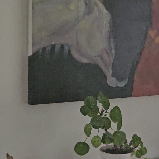 To heste, en sort og en hvid, hviler deres hoveder mod hinanden i en gestus af forståelse, nærvær og ro. Trøst er et maleri, der indfanger det usagte – det bånd, der eksisterer mellem væsener, som forstår hinanden uden ord. Hestenes beroligende adfærd, de såkaldte calming signals, afspejler en dyb forbindelse, hvor styrke og sårbarhed smelter sammen i ren harmoni.