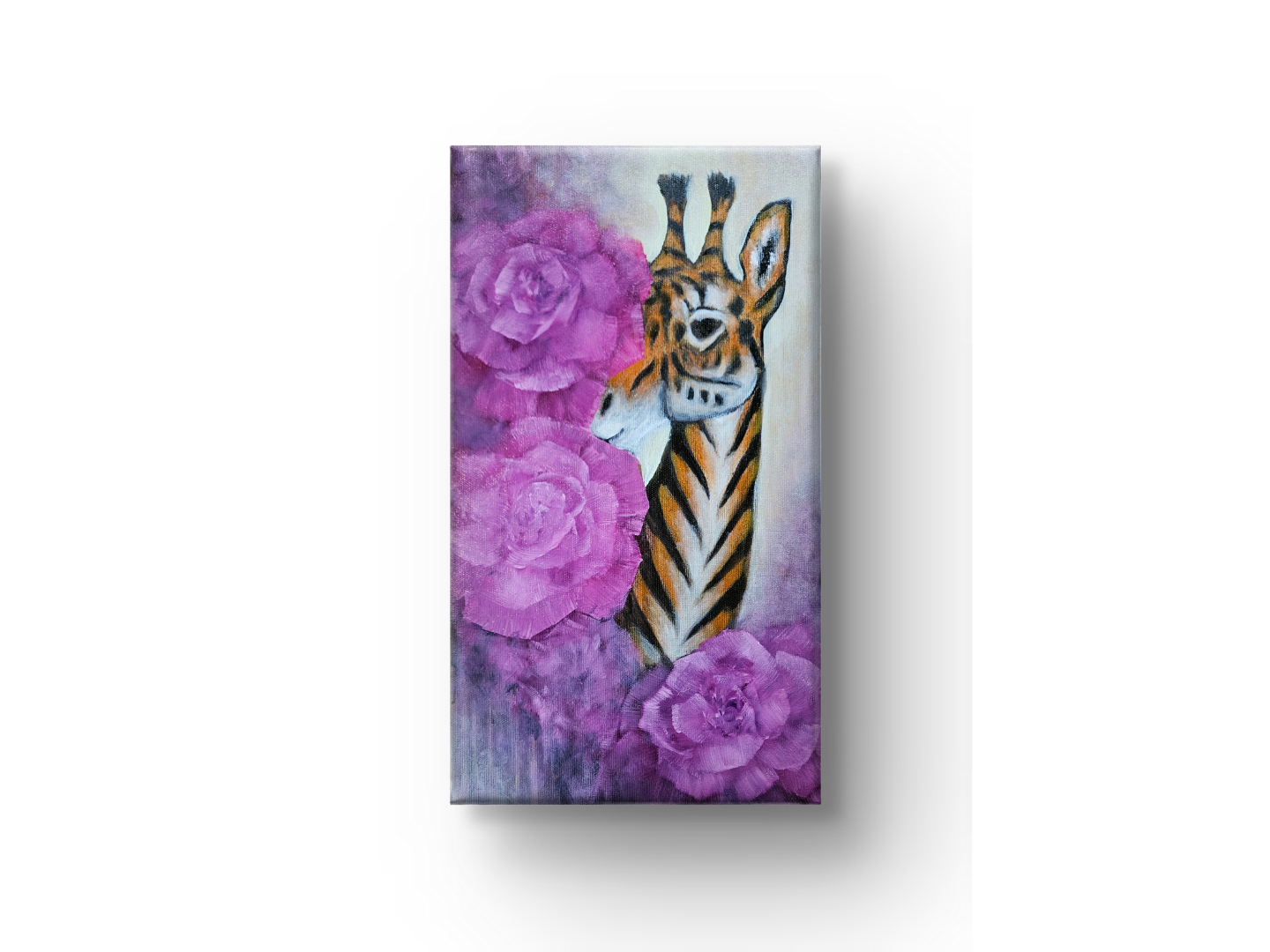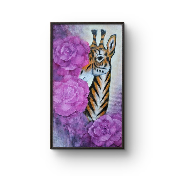 En giraf med tigerens striber titter forsigtigt frem fra nogle store, abstrakte lyserøde blomster. Dens væsen er både blidt og vildt, både observerende og modigt. Den sarte gule baggrund skaber en lethed, der balancerer de stærke kontraster i dyrets mønster. Dette er et symbol på transformation – en invitation til at forene de sider af os selv, vi måske før har troet ikke kunne eksistere sammen.